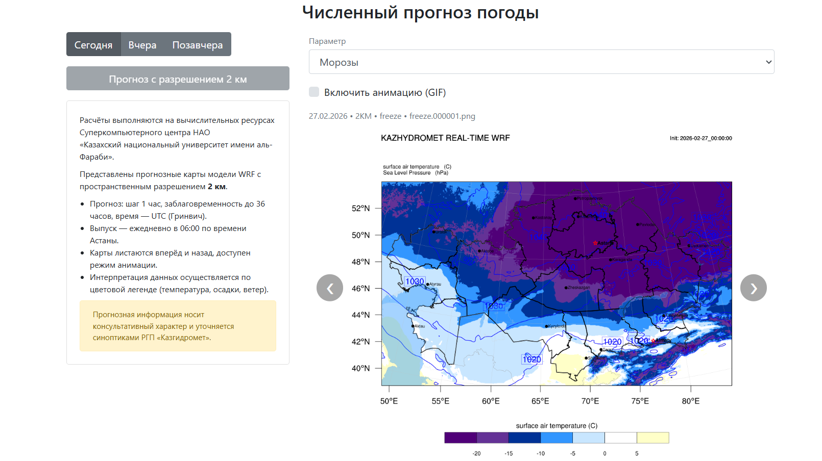 Прогноз обновляется ежедневно в 06.00 по времени Астаны. Шаг обновления составляет один час, а горизонт прогнозирования - до 36 часов. Для удобства пользователей предусмотрена цветовая шкала, позволяющая быстро оценить погодные условия.