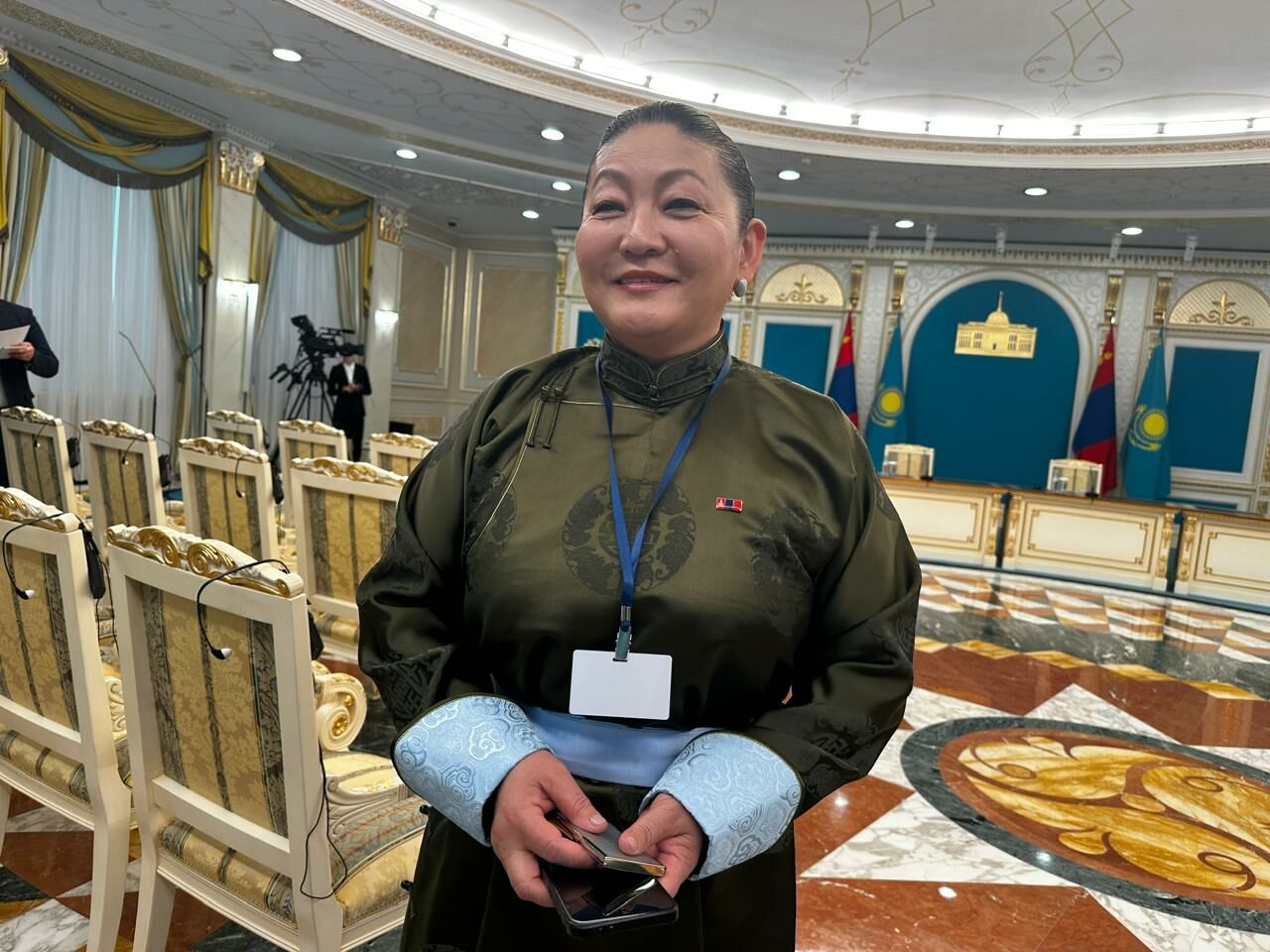 В это время в холле уже осваивалась монгольская делегация. Шестнадцать чиновников, приехавших заранее, фотографировались на фоне интерьеров. Особенно выделялись три женщины в ярких национальных костюмах «дэли» с длинными рукавами, высоким воротником-стойкой и поясом-кушаком.