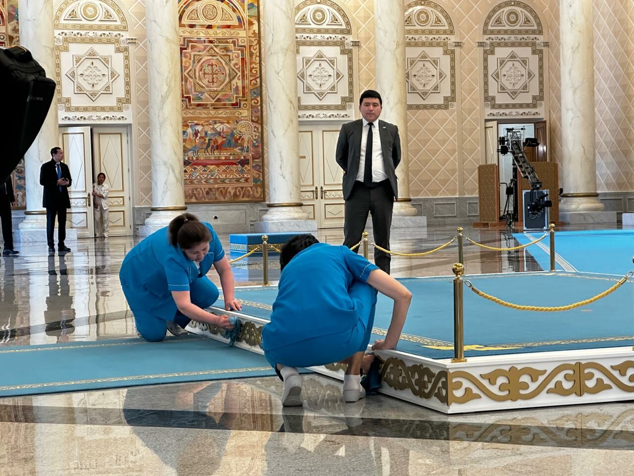 Те, кто открывает массивные двери перед главами государств, репетировали синхронность движений. Технический персонал в очередной раз проходился по бирюзовой дорожке, доводя до блеска каждый сантиметр, включая пьедестал, на котором через считанные минуты будут стоять президенты.