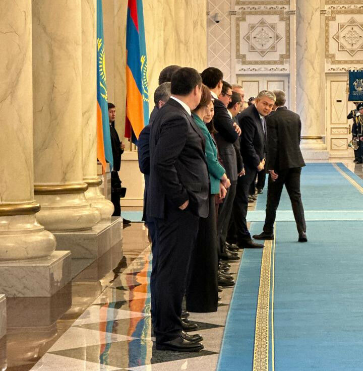 За 10 минут до приезда в Акорду Пашиняна казахстанские министры уже стоят в ряд, но пока не носок к носку. Шутят, переговариваются, высовывают головы из строя, чтобы перекинуться словом с коллегой. Классическая школьная линейка, только в очень строгих костюмах!