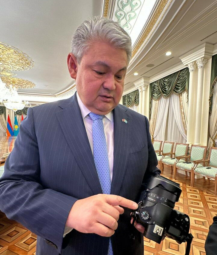 Пока министры ждут президентов, им становится скучно - сами подходят к журналистам. Вот министр иностранных дел Кошербаев увидел фотокамеру у моего коллеги - и начал рассказывать, какие лучше: