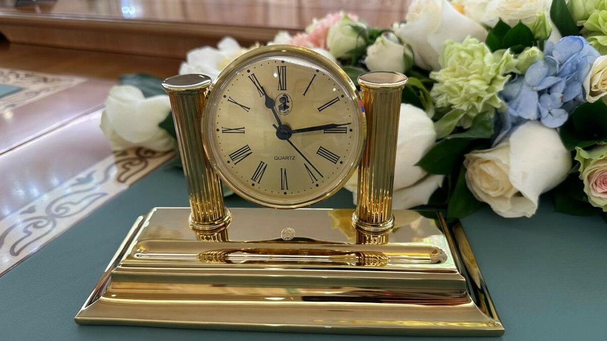 Пока президенты беседуют тет-а-тет, журналистов впускают в другой зал - для переговоров сторон в расширенном формате. Глазам открывается просторный интерьер. В центре - большой овальный стол, лакированный так, что отражает три люстры. С каждой стороны за столом расставлены стулья - 10 для армянской делегации, 14 - для казахстанской. Перед каждым участником - аскетичный набор для переговоров: вода, стакан, блокнот, ручка, наушники перевода. На центральных местах, где сядут лидеры стран, установлены настольные позолоченные часы. Возможно, чтобы стороны не теряли чувство времени.