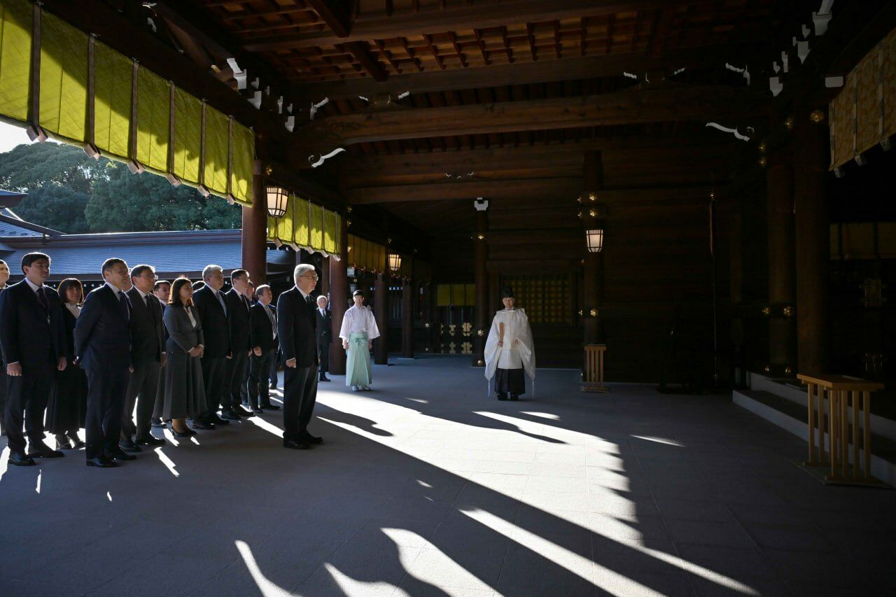 Из дворца президентский кортеж направился в крупнейший синтоистский храм Токио - Мэйдзи, посвящённый императору Мэйдзи, человеку, который открыл Японию миру и запустил её стремительную модернизацию.