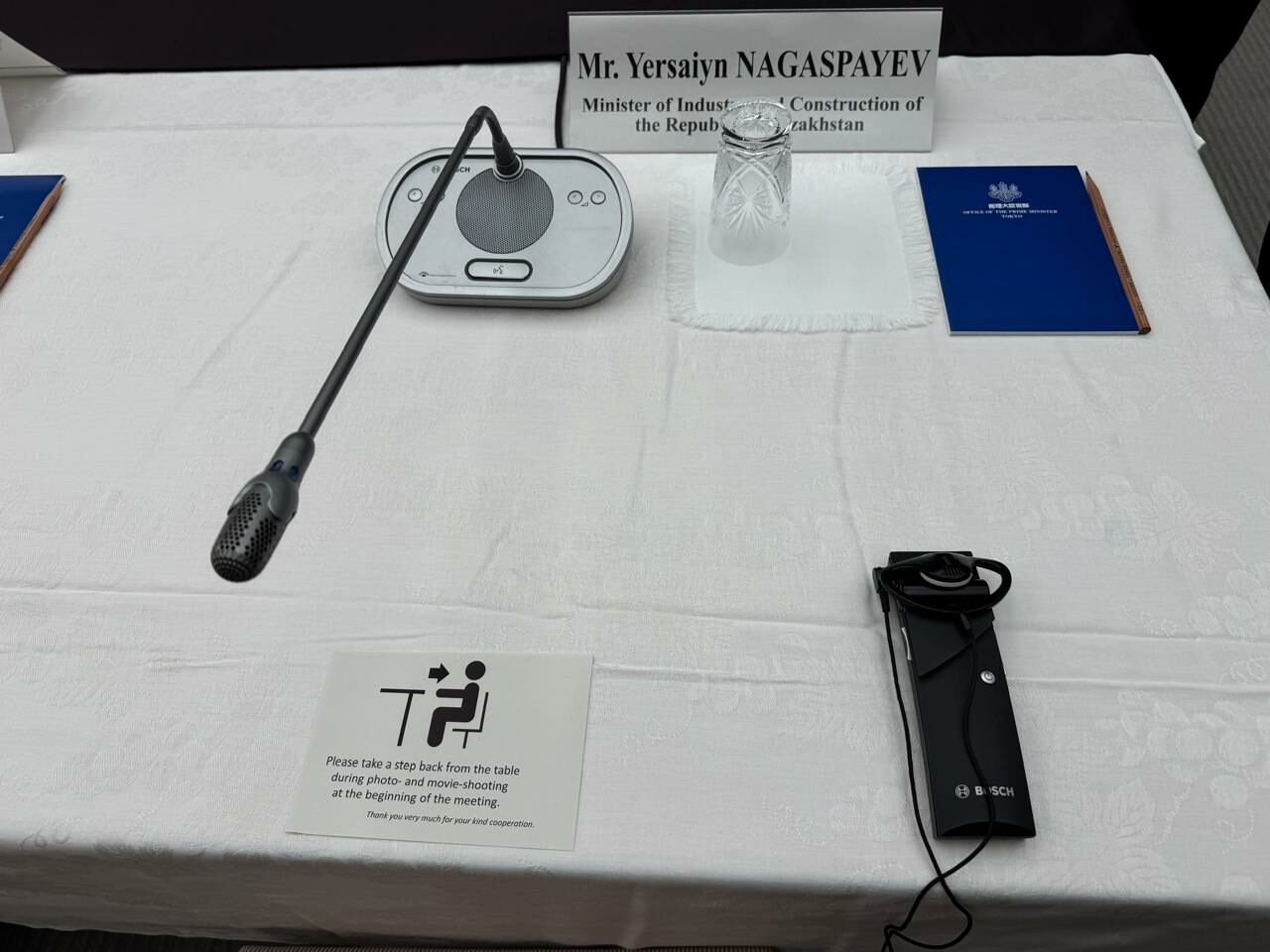 На столах, где пройдут двусторонние переговоры, аскетично расставлены вода, блокнот, карандаш и наушники для перевода. И забавная деталь: перед каждым делегатом лежала наклейка с текстом: «Пожалуйста, отодвиньтесь от стола во время фото- и видеосъёмки в начале переговоров».