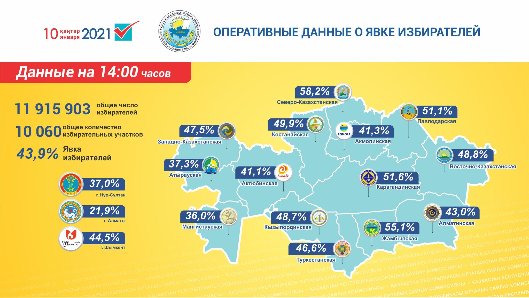 Согласно данным, представленным областными, городов республиканского значения, столицы избирательными комиссиями по состоянию на 14 часов времени столицы 10 января 2021 года избирательные бюллетени получили 43,9 % от общего количества избирателей, включенных в списки.