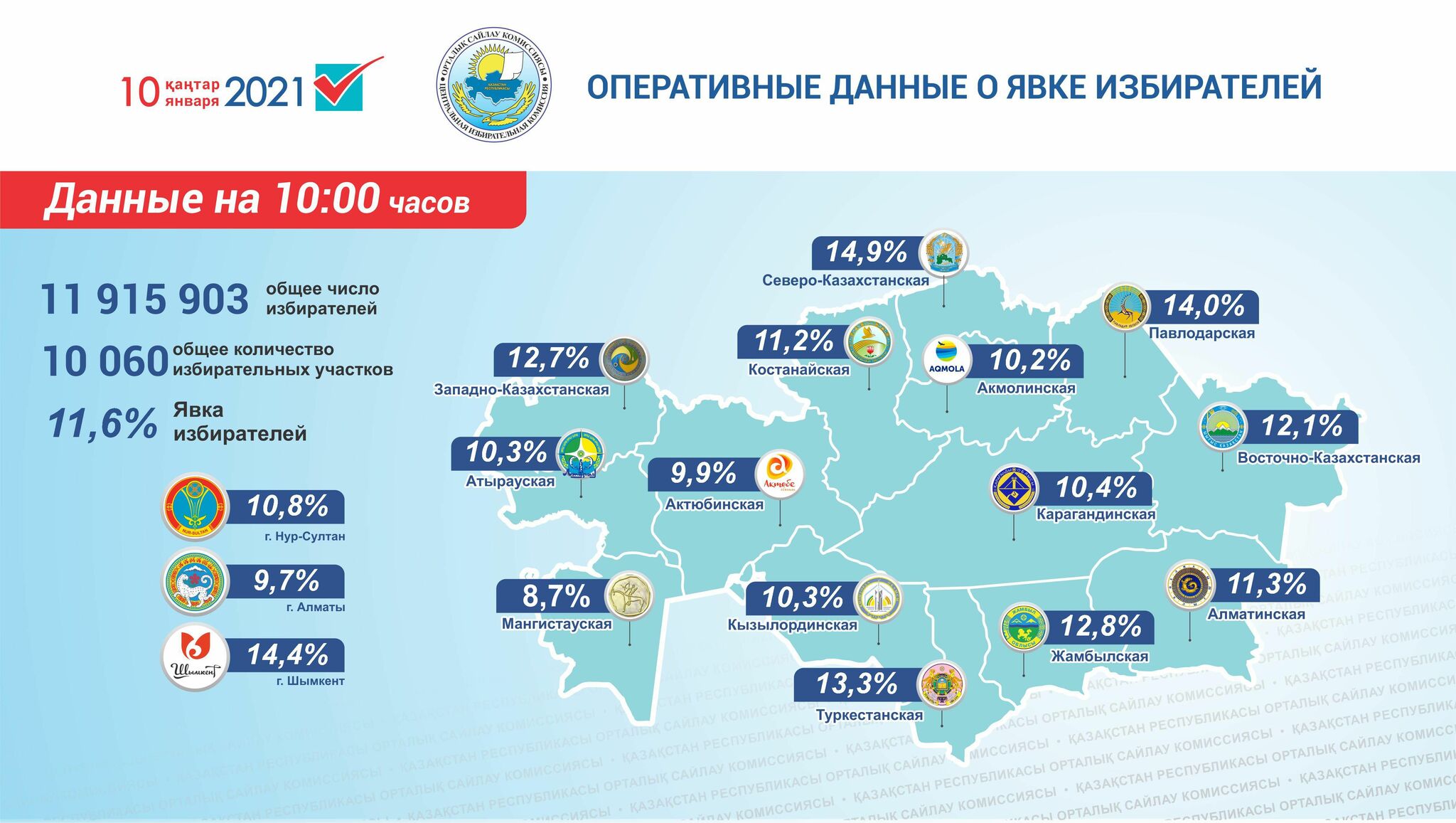 Согласно данным, представленным областными, городов республиканского значения, столицы избирательными комиссиями по состоянию на 10 часов 10 января 2021 года избирательные бюллетени получили 11,6 % от общего количества избирателей, включенных в списки.