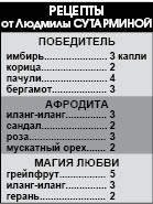 - Пожалуйста, вот несколько рецептов. Только смешивать масла надо грамотно. Нужно взять эфирное масло, влить туда другое и медленно крутить флакон по часовой стрелке, перемешивая субстанции, дать настояться минут 20-30 и добавлять следующий компонент, проделывая то же самое. А уже потом, когда смесь готова, в зависимости от того, как вы собираетесь ее применять, нужно добавлять 75 капель на 100 миллилитров масла - для тела, 38 - для лица и так далее. Наносить их в качестве духов нужно на точки пульсации: за ушами, на запястья, локтевые и коленные сгибы, между грудями и на область пупка.