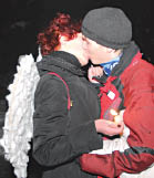 На площадь в основном пришли школьники и студенты - большинство без вторых половинок. “Одиночки” расхаживали по площади с воздушными шарами: это означало, что они ищут себе пару для лобзаний. Девочки лет 13-14 бродили по площади и кричали: “Шведская семья из трех девушек ищет трех парней”. А парочки ждали, когда же начнется самое главное. Все стали зажигать свечи. И тут по сигналу влюбленные увлеченно слились в поцелуе.