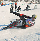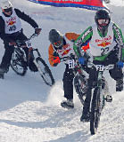 Шесть десятков горных велосипедистов с утра до вечера “убивались” на 500-метровом снежном склоне. Уже в квалификационном раунде организаторы недосчитались пятерых экстремалов: у одного перелом ключицы, другой сломал ребра, еще трое неудачно приземлились на руки. 32 счастливчика пробились сквозь сито квалификации, а в финал вышли четверо гонщиков.