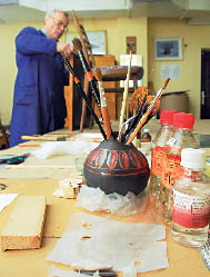В нынешний приезд руки Ревина дотянулись наконец до картин, входящих в постоянно действующую экспозиции музея. Были выбраны самые “больные”: где-то полотно покрыто жирными пятнами от прикосновений посетителей, где-то поражено плесенью, насекомыми. Чтобы убить одним выстрелом двух зайцев, Олег Михайлович взялся по ходу реставрационных работ обучать кастеевских реставраторов.