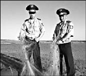 На снимке: сотрудники природоохранной полиции Еркин ДЮСЕНБЕКОВ и Талгат КУРМАНБАЕВ уничтожают сети китайского производства.