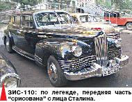 ЗИС-110, серийный выпуск которого был начат в 1945 году. Когда-то он принадлежал первому секретарю ЦК Компартии Армении. Вообще, эта машина была грозой всего, что движется или стоит. В ней ездила власть, которую почитали и боялись. Автомобиль действительно способен вызвать трепет: длина кузова - 6 метров 20 см, высота - 1730 см, ширина - 1960 см. Кстати, сам Сталин использовал бронированный ЗИС-115, внешне не отличимый от “сто десятого”. Всего их было тридцать - созданных специально для Политбюро. Сталинские броневики испытывали боевыми пулеметами, причем во время испытаний конструктор машины должен был находиться внутри автомобиля и мог погибнуть, если броня не выдержит обстрела... Потом кузов реставрировали, заделывали вмятины, но говорят, что две машины с конструкторами “испытали” так, что восстанавливать их уже не было смысла. Зато проверенным ЗИСам Сталин безгранично доверял. Если верить легенде, то передняя часть машины была срисована с лица Сталина. Еще одна веха истории - это
