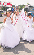 В минувший четверг к магазину “Рамстор” подкатили два белых свадебных лимузина. Распахнулась дверь первого из них, и на асфальт опустилась ножка в белой туфельке. Невеста в пене белых кружев выбралась из машины и стала поправлять прическу. Невольные свидетели свадебной процессии устремили свои взгляды на дверь: какому счастливчику досталась такая красавица? Но в дверях показалась... другая невеста. “Неужели “нетрадиционная” свадьба?” - зашептались зеваки. Но тут из лимузина вышла еще одна невеста. А потом еще и еще...