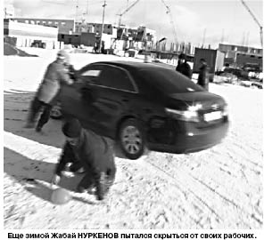 Дело едва не дошло до смертоубийства. Когда в конце прошлого года отчаявшиеся рабочие окружили директора Жабая Нуркенова, чтобы выбить свои кровные, тот, запрыгнув в новенькую “Тойоту-Камри”, поехал на “бунтовщиков”. При этом он отдавил одному из них ногу и получил вмятину на капоте каской от столкновения с рабочим, который, слава богу, не пострадал.В результате того ноябрьского скандала на совещании у акима начальник горотдела строительства