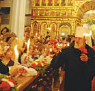 Благодатный огонь из рук паломников принимает митрополит Астанайский и Алматинский Мефодий. Спустя мгновения он зажигает пучок больших свечей, от которых с благословения владыки огонь разносят по всему храму - от свечи к свече. Огненный круг разрастается, и волны пламени уже вытекают на улицу.- Этот огонь не имеет природно-естественного источника и потому именуется благодатным, - отмечает митрополит. - Это символ очищения нашей души. Несите его в свои жилища, освящайте свои дома - и будьте благословенны!
