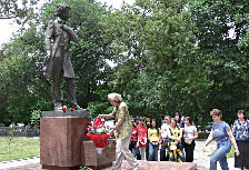 памятника Александру Сергеевичу ПУШКИНУ появилась корзина с цветами. Памятник, между прочим, тоже отметил свой юбилей: 5 лет назад он был открыт при большом стечении народа. Идея установки монумента принадлежала Русской общине, а средства выделил облакимат. Автор таразского Пушкина скульптор Сейткарим МОМЫШ с гордостью вспоминает, как нелегко он завоевывал право на ваяние статуи: пришлось пройти многоступенчатый конкурс, а также противостоять желанию кое-каких влиятельных персон дать заказ “своему” человеку.