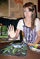 Кати БАРКОВОЙ (на снимке) необычное увлечение - она рисует подушечками пальцев и кончиками ногтей.По признанию девушки, рисовать необычным образом она стала случайно. Кисточка, которой Катя водила по холсту, распушилась, и никак не получался нужный мазок. Тогда она надумала дорисовать картину указательным пальцем. Получилось то, что надо. Позже девушка убедилась: полотна получаются более “живыми”, особенно если писать природу, пейзажи.