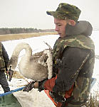 На снимке: и. о. начальника водно-спасательной станции Петропавловска Антон КОПТЯЕВ со спасенным лебедем.