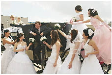 Будущих невест, пришедших на выставку, фотомастера заманивали не только оригинальными работами. Всем желающим было предложено надеть свадебное платье и бесплатно сделать пару снимков. Чем и воспользовались десяток юных особ. Тем более что позировать было где. На праздник подогнали для невест роскошные лимузины и даже карету!