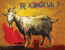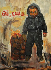 - С каких пор художники стали интересоваться политикой?- Сейчас от нее невозможно никуда спрятаться. Нам говорят, что мы живем даже лучше, чем некоторые государства в Восточной Европе. Говорят, что у нас демократия, что мы вот-вот войдем в пятьдесят развитых государств мира. С кризисом ощущение имитации только усилилось... Кстати, цифре пятьдесят тоже посвящена картина: на фоне самолета в окружении летающих огурцов стоит апашка в тулупе. Образ этой женщины я увидел в городе. Как-то возле ЦУМа ко мне подошла бабушка и попросила купить пирожков. Я купил, а бабушка смотрит голодными глазами и просит еще... В какие пятьдесят развитых государств мы можем войти, если в центре южной столицы стоит бабушка и просит купить пирожок?