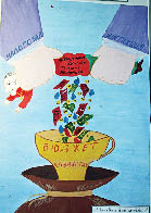 “Думан”.…Страшненькие монстры склонились у детской кроватки и не дают спать. Это - неуплаченные налоги. Поэтому заплати - и спи спокойно. Колобок сидит на руке у налогового инспектора, который не дедка с бабкой и от которого не уйдешь. Вот такие бесхитростные сюжеты преобладали на экспозиции.