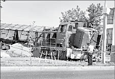В минувшую пятницу в центре Костаная случилась железнодорожная авария.С рельсов сошел грузовой состав с зерном, принадлежащий компании “Иволга”. Восемь зерновозов, сорвавшись с тормозов, прокатились более полукилометра и влетели на территорию мельничного комбината. Они столкнулись со стоявшим на пути локомотивом, серьезно погасившим инерционную скорость движения состава. Но удар был настолько силен, что грузовая громада, пробив железобетонный забор, вылетела за пределы предприятия, остановившись в полутора метрах от автотрассы.