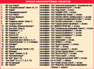 Фондом недвижимости на сегодня заключены договоры по финансированию 27 объектов незавершенного строительства на общую сумму 90,5 млрд. тенге, из них 69,7 млрд. тенге выделено на завершение строительства в Астане, 16,1 млрд. тенге - на объект в Алматинской области и 4,7 млрд. тенге - для Алматы. В рамках подписанных договоров два объекта (жилые комплексы “Аль-Арка” и “Акжайык”) уже введены в эксплуатацию. Финансирование еще 8 объектов на общую сумму 43,8 млрд. тенге находится на различных стадиях рассмотрения.