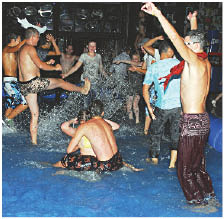 “Sклад” выдался жарким. Словно предчувствуя затяжные дожди, здесь праздновали лето.Гвоздем вечера были женские бои без правил… Ровно в полночь ведущий пригласил всех... в бассейн. Резиновая емкость внушительных размеров и глубиной полметра. Публику долго уговаривать не пришлось - дамы с визгом скидывали туфли на шпильках, и туча брызг полетела на go-go-девочек, зажигавших на помостах из бочек. Зрители, оставшиеся в стороне, всерьез обсуждали, можно забеременеть после таких танцев или нет. Бой проходил в формате шоу, но со всеми атрибутами настоящего поединка - три раунда с судейством симпатичного рефери и осмотром участниц на предмет травмирующих деталей. Организаторы клялись, что биться вышли две профессионалки в вольной борьбе, а кисель сварил повар клуба лично.