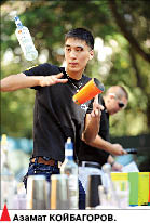 “баланс” бутылки на руке, плече или голове и сосредоточенно пытались повторить домашние заготовки.Первыми на “поле битвы” вышли начинающие бармены. Для гостя из шахтерской столицы Азамата КОЙБАГОРОВА этот выход на публику был дебютным. Барменствует он всего три года, а “кидает” и того меньше - полтора. Однако это не помешало карагандинцу сорвать шквал аплодисментов зрителей и впечатлить судей. Его напарник по команде Михаил САФРОНОВ тоже не подкачал и стал третьим среди начинающих.