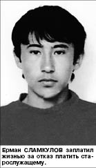 “дедушке” пополнить баланс его мобильного двумя тысячами тенге... В среду, 22 декабря, приговор вступил в силу.Трагедия случилась в Актау. Рано утром в воинскую часть № 2095 на погранзаставу “Бейнеу” прибыло молодое пополнение, а уже после обеда “старики” решили преподать “духам” первые уроки жизни. Избежать “кулачной педагогики” можно было только за деньги, но Ерман наотрез отказался платить. А в 23 часа его не стало: несколькими ударами, нанесенными фалангами пальцев по горлу, Есенбаев раздробил ему кадык, и Сламкулов задохнулся по дороге в больницу...
