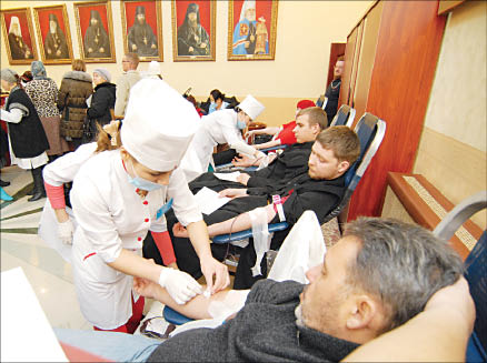 Бригада врачей дежурила у собора с самого утра. Медики развернули временный пункт приема крови в здании епархиального управления. В одной из комнат, украшенной иконами, установили кресла для забора крови и разместили врачей. После окончания утренней службы сюда потянулись прихожане, решившие сдать кровь. Не остались в стороне и сами священнослужители. Сначала им, как и всем остальным, пришлось ответить на вопросы специальной донорской анкеты. Среди безобидных “Сдавали ли вы раньше кровь?” попадались не вполне соответствующие данной обстановке вопросы: “Были ли у вас случайные половые связи за последние два месяца?”. Священники смущались... Конечно, желающих сдать кровь было гораздо больше, чем тех, кому медики разрешили это сделать.