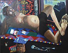 - За окном проходят выборы, Олимпиада идет или еще что-то, а ему все равно,- поясняет художник. - Ни о чем его голова не болит, и ни в чем он не хочет участвовать, потому что думает, что ничего не сможет изменить. Лежит, ест китайскую лапшу и курит американские сигареты. К сожалению, это образ жизни многих казахстанцев.