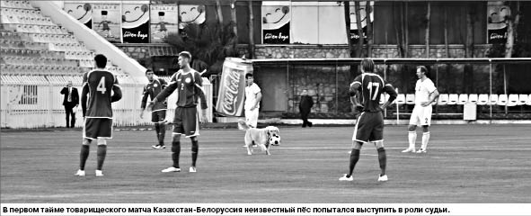 Встреча началась с атак наших, но пыл казахстанцев вначале умерил Вячеслав Глеб, младший брат Александра, который без помех, хотя и неточно, пробил по воротам Андрея СИДЕЛЬНИКОВА. А затем непонятно откуда взялась собака. Она по-хозяйски выбежала на поле, взяла в зубы мяч и направилась с ним к центру. На усмирение пса потребовалось несколько минут, после чего инициативу перехватили белорусы. Они-то счет и открыли, когда за минуту до свистка на перерыв в нашей штрафной сфолил Максим АЗОВСКИЙ. Арбитр из Молдавии назначил пенальти, который четко реализовал Вячеслав Глеб, - 1:0 в пользу белорусов.