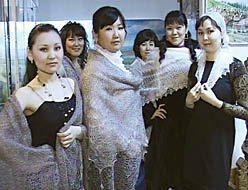 На снимке: Юные актюбинские модницы с удовольствием примеряют знаменитые пуховые платки.