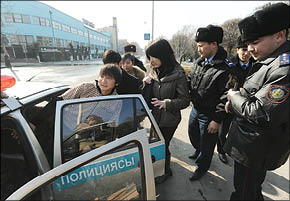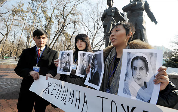 Молодые люди держали в руках фотографии наиболее известных в мире женщин-политиков - госсекретаря США Хиллари КЛИНТОН, федерального канцлера Германии Ангелы МЕРКЕЛЬ, бывшего премьер-министра Пакистана Беназир БХУТТО и Розы Отунбаевой. По их словам, аналогичный флешмоб прошел в этот день в Шымкенте. По сути, участницы акции почти буквально повторили сказанное президентом страны тремя днями ранее - на съезде женщин. Тем не менее всех участников акции задержали полицейские и доставили в Алмалинский РОВД.