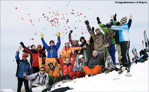 После трудного подъема все собрались на вершине. Мужская половина команды приготовила для милых леди сюрприз: девушек засыпали лепестками роз. После торжественных поздравлений с праздником и горячего чая с шоколадом райдеры по одному начинают спуск.