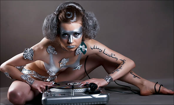 Вообще-то лучшими объектами для раскрашивания считаются стриптизерши. У них великолепная фигура, ухоженная кожа, они умеют позировать. А самое главное - не стесняются раздеваться на людях. Нинель же работает диджеем и за деньги не раздевается принципиально. Хотя очень часто девушки-диджеи делают своей фишкой именно работу топлес.