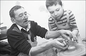 - Нужно работать кончиками пальцев. Вот так, аккуратнее, - художник-керамист Марат САРСЕБАЕВ пытается обучить азам гончарного искусства мальчика лет семи.