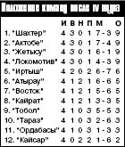 Приводим другие результаты IV тура: “Атырау” - “Кайрат” (Алматы) -2:2, “Иртыш” (Павлодар) - “Восток” (Усть-Каменогорск) - 3:1, “Ордабасы” (Шымкент) - “Тараз” - 0:1, “Жетысу” (Талдыкорган) - “Кайсар” (Кызылорда) - 3:0.