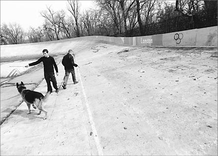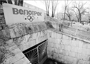 Вместе с вице-президентом Федерации велоспорта Алматы Владимиром ОСИПОВЫМ мы отправились на велотрек. Увиденное привело нас в ужас. Бетонное полотно сплошь в выбоинах и ямах, подсобные помещения и коммуникации приведены в негодность, а по полотну выгуливают собак.