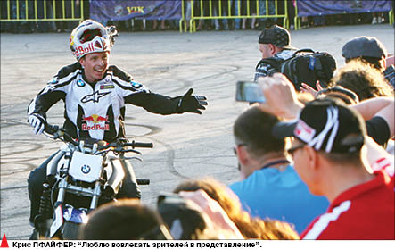 Ближе к шести вечера на площадь потянулся народ, жаждавший воочию увидеть трюки и финты заморского гостя. А посмотреть было на что. Впервые на мотоцикл Крис сел в пятилетнем возрасте, а уже в 10 лет начал участвовать в соревнованиях по триалу. В 41 год он собрал внушительное количество побед: четырежды стал чемпионом мира и Европы по стантрайдингу. Есть в его арсенале и рекорды: восхождение на триальном мотоцикле на отвесную скалу в Арко (Италия), прыжок на мотоцикле без трамплинов через 33 лежащих рядом человека, прокручивание 15 раз на заднем колесе за 30 секунд. И даже коронный поцелуй с девушкой при выполнении трюка!