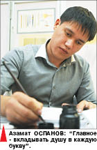 - Арабская вязь делится на восемь видов и 400 подвидов, - рассказывает студент четвертого курса факультета востоковедения КазНУ им. Аль-Фараби Азамат ОСПАНОВ. - В одном из хадисов пророк Мухаммед говорит: “Письмо - половина знания”, поэтому в арабских странах степень владения каллиграфией - показатель образованности и духовного совершенства человека. С древних времен каллиграфия считается” благороднейшим из изящных искусств”. При этом ее можно смело назвать наукой, так как без теоретических знаний здесь не обойтись: длина линий, контуры, наклон пера, соединение букв - все рассчитано!