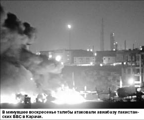 Вечером в минувшее воскресенье была атакована авиабаза пакистанских ВВС в Карачи. По версии полиции, 10-15 талибов, вооруженных гранатами, реактивными снарядами и автоматами, произвели как минимум девять взрывов, за которыми последовала ожесточенная перестрелка.