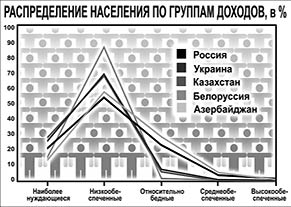 В Белоруссии “нуждающихся” и “низкообеспеченных” оказалось более 67%, а обеспеченных и богатых - 4,5%. В Азербайджане, Казахстане и Украине обеспеченных, по меркам авторов исследования, людей обнаружилось исчезающе мало, доли процента. Подавляющее большинство - более 90% граждан во всех трех странах - социологи отнесли к беднякам.