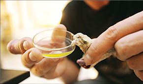 - У нас в питомнике - нет. Это делается в серпентарии. Иногда ко мне обращаются спецслужбы, чтобы я определил настоящий ли это яд гюрзы. Один грамм сухого яда гюрзы со всеми документами стоит больше тысячи долларов. Чтобы получить этот грамм, надо “подоить” 10 “ползучих коровок”.