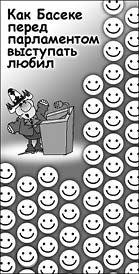На днях депутат киргизского парламента от оппозиционной партии “Ар-Намыс” Акылбек ЖАПАРОВ предложил по примеру американского конгресса разместить в зале заседаний надпись “Мы веруем в Бога”. В свою очередь депутат от правящей Социал-демократической партии Данияр ТЕРБИШАЛИЕВ заявил, что нужно добавить надпись “Мы работаем ради народа”. Наконец, еще один народный избранник Турсунбай БАКИР-уулу призвал установить на трибуне детектор лжи. Трудно судить, как эти нововведения помогут эффективной работе депутатов. Помнится, в начале весны прямо во дворе Жогорку кенеша они принесли в жертву несколько баранов, чтобы изгнать из парламента злых духов, которые мешали им принимать хорошие законы. Не помогло.