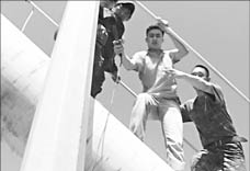 Пожаловавшись журналисту на обидчиков, возмутитель спокойствия позволил спасателям спустить себя вниз.