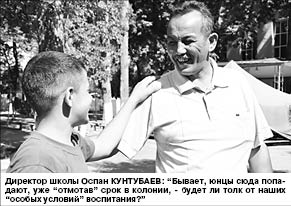 ...За годы существования эта спецшкола, контингент которой традиционно составляли малолетние преступники из всех регионов Казахстана, кроме почему-то южного, пережила несколько этапов становления. Лет тридцать назад по большим праздникам в городе можно было увидеть колонну обритых наголо мальчишек в одинаковых серых костюмах старомодного покроя - они казались забитыми и несчастными, зато как играл их духовой оркестр! Это был советский период спецшколы, тогда многие ее воспитанники впоследствии становились честными тружениками и в своих письмах из рабочих поселков или колхозных деревень благодарили альма-матер за науку. В годы перестройки, поддавшись модным веяниям, режимная школа превратилась в “мальчишескую республику” со своим “парламентом” и “президентом”. Похоже, новшество имело эффект - питомцы той школы с удовольствием занимались спортом, играли в спектаклях школьного драмкружка и частенько отрекались от своего мрачного прошлого.