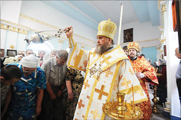 ...Затрепетали на ветру хоругви, вознеслись над головами богомольцев святые иконы, зазвучали молитвенные песнопения. Глава митрополичьего округа в Казахстане митрополит Астанайский и Казахстанский Александр совершил крестный ход вокруг церкви, освящая ее стены.