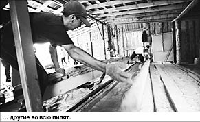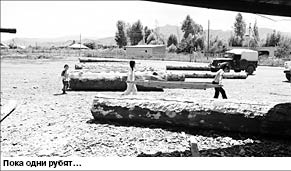 Следующий пункт - лесопилка в Большом Аксу. Работа кипит. Установка “Тайга” нещадно полосует лес. На улице мужики сбивают облицовку для домиков - такая сборная конструкция. Кубометр - 1300 тенге. Четыре стены в среднем тянут на - 130 тысяч. Ели, которые валят, от 5 до 10 кубометров. Один кубометр чистого материала - 30-35 тысяч тенге - такие цены в Алматы. В общем, цена одной поваленной ели “на выходе” до 350 тысяч тенге. Вот вам и вся экология…